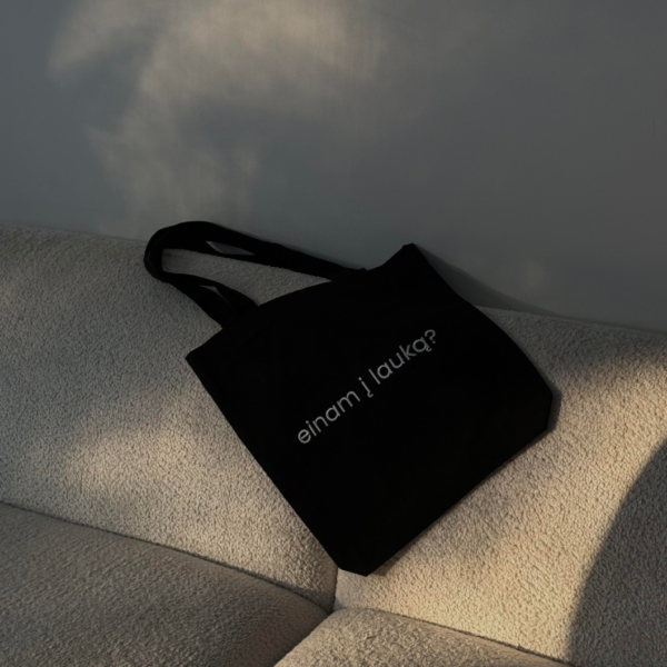 - Išorinė kojinės pusė – siuvinėtas užrašas EINAM Į LAUKĄ? Vidinė kojinės pusė – siuvinėta pėdutė